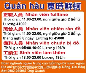 ★Nhân viên fulltime Thời gian: 11:00-23:00, nghỉ 2 tiếng Lương 41000 ★Nhân viên chiên đồ Thời gian: 11:00-20:00, nghỉ 2 tiếng Lương từ 45000 Hai vị trí trên tháng nghỉ 8 ngày, hoan nghênh phụ nữ nội trợ, người nước ngoài Ông Quách 0982-090987 Địa chỉ: 台北市大同區延平北路三段50號( Đại Đồng, Đài Bắc)