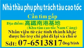 Thi công/ bảo trì điện tàu cao tốc Làm ca đêm Nhân viên làm việc Lương từ 45000 Tháng nghỉ 6-8 ngày, không yêu cầu kinh nghiệm Làm việc trên cao, có BHLD BHYT, bảo hiểm đoàn thể Địa điểm: 高鐵南港基地( Khu tàu cao tốc Nam Cảng) Nhân viên từ các tỉnh thành khác được hỗ trợ chi phí đi lại và chỗ ở