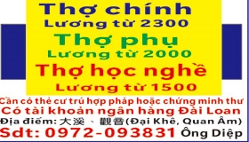 Thợ chính Lương từ 2300 Thợ phụ Lương từ 2000 Thợ học nghề Lương từ 1500 Thời gian: 08:00-17:00 Có tiền cơm trưa, nước uống, tự chuẩn bị phương tiện đi làm Thưởng tết, liên hoan công ty Cần có thẻ cư trú hợp pháp hoặc chứng minh thư Có tài khoản ngân hàng Đài Loan Địa điểm: 大溪、觀音( Đại Khê, Quan Âm)