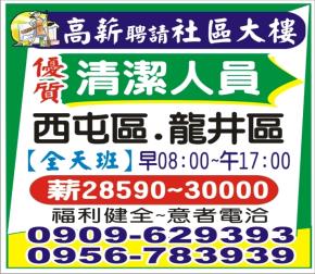 誠徵-西屯區、龍井區【社區大樓清潔員】