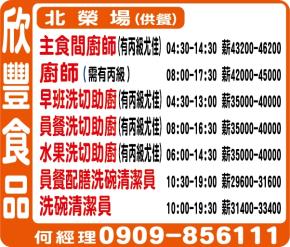 欣豐食品 誠徵 北榮場(供餐)高薪