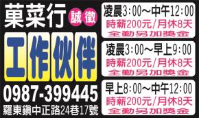 • (1)凌晨3:00~中午12:00 (2)凌晨3:00~早上9:00 (3)早上8:00~中午12:00,以上均月休8天,全勤另加獎金