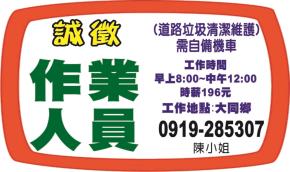 • 道路垃圾清潔維護,需自備機車,工作時間:早上8:00~中午12:00