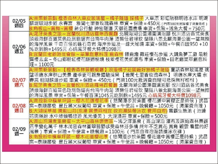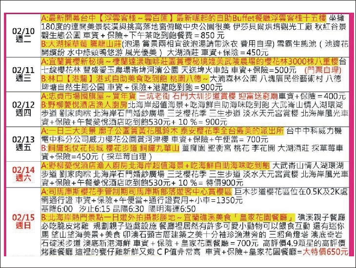 劉家肉粽-北海岸石門婚紗廣場-三芝櫻花季-三生步道-淡水天元宮賞櫻-北海岸風光-車資+保險+午餐薆悅酒店吃到飽530元+10%=900元