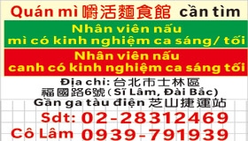 Nhân viên nấu mì có kinh nghiệm ca sáng/ tối Nhân viên nấu canh có kinh nghiệm ca sáng tối Nhân viên theo giờ, lương từ 220/h Ca sáng 08:00-15:30 Ca tối 15:30-21:30 Yc kinh nghiệm ( Cần cố định ca làm) Hoan nghênh phụ nữ nội trợ, sinh viên mới tốt nghiệp Thưởng công việc, cuối năm Có BHLD BHYT, bảo hiểm đoàn thể, hưu trí