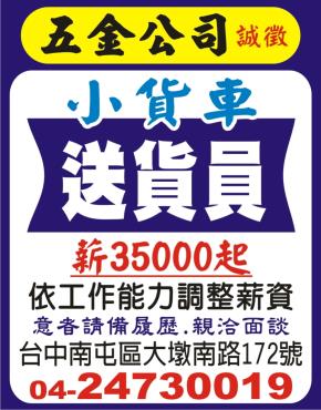 五金公司誠徵【小貨車送貨員】