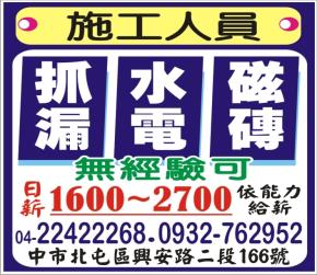• 工作職缺: 抓漏.水電.磁磚.施工人員