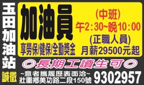 • 正職人員,中班:午2:30~晚10:00,長期工讀生可,意者攜履歷表面洽