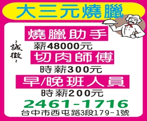 • 工作職缺: 切肉師傅/燒臘助手