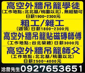 • 工作職缺: 高空外牆吊籠學徒(工作地點:北北基/桃園以北).無經驗可 (電洽0927653651詹先生)