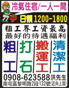 • 工作職缺: 【粗工】【打石】【搬運】【清潔】