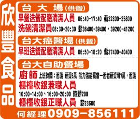 • 工作職缺: 台大場(供餐)早餐送餐配膳清潔人員 06:40-17:40 薪資:32800-35800