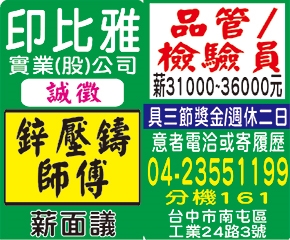 • 工作職缺: 鋅壓鑄師傅/品管/檢驗員