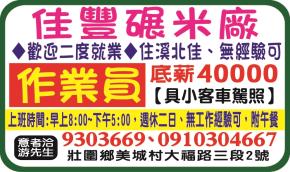 • 歡迎二度就業,住溪北佳、無經驗可,具小客車駕照,上班時間:早上8:00~下午5:00,週休二日,無工作經驗可、附午餐,意者洽