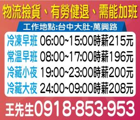 • 工作職缺: 物流撿貨(冷藏)大夜:24:00~09:00時薪208元