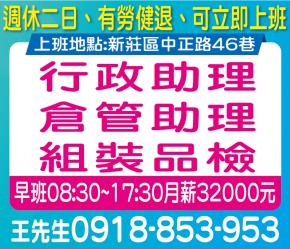 • 工作職缺: 1、行政助理(早班08:30〜17:30) 2、倉管助理08:30〜17:30) 3、組裝品檢(早班08:30〜17:30)